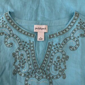 Peck & Peck Blue Embroidered Linen Tunic Top 3/4 Sleeves & Split Neckline-SZ XL