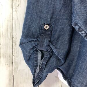 Chambray, lightweight, open front, draping front, roll tab sleeves, colors may vary due to lighting, good used condition, size: L