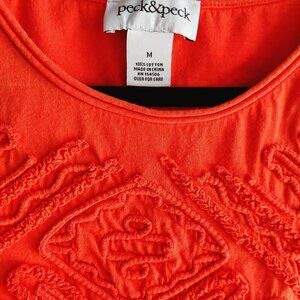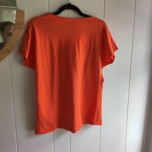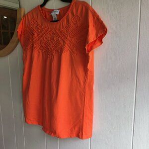 Beautiful embroidery on a bright orange knit cotton top. Great casual wear goto for shopping walking or entertaining.