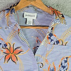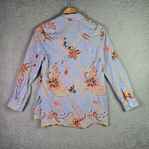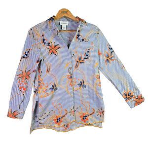 Make a statement with this Peck & Peck embroidered shirt in Small—striking blue stripes and vivid orange/navy floral embroidery. Features a scalloped hem and hidden button placket for an extra edge. Soft, 100% cotton for all-day comfort. Instantly transforms jeans, shorts, or skirts with resort vibes and elevated boho flair. Excellent condition, no flaws.
