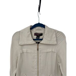 Features: Gold zipper front. Pockets. Roll tab sleeves. Collar. Linen Blend. Full zip.