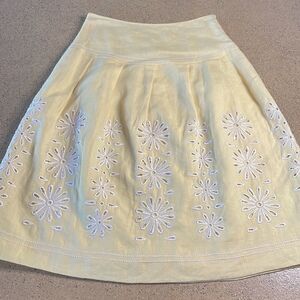 Peck & Peck Petite yellow 100% linen embroidered drop waist A-Line Midi skirt. Features beautiful 100% linen in a buttery soft yellow, drop waist, fully lined, side zip entry and absolutely stunning cutout floral embroidered design. Gently worn with a few tiny spots and, not a flaw but it does have a nubby texture to it due to the characteristics of the fabric (see last 4 pics). See pics for measurements. This would be absolutely adorable with a chambray shirt and some kitten heels!
