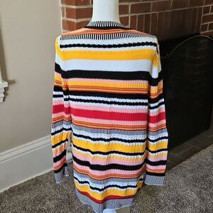 Peck & Peck's open cardigan with red and orange stripes creates an eye-catching look. The sweater offers a relaxed fit and an open front design makes it perfect for layering. This is in great previously owned condition.