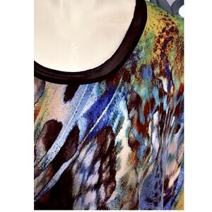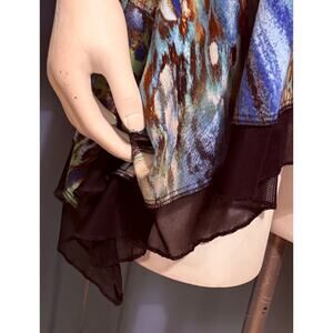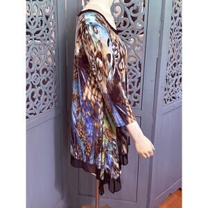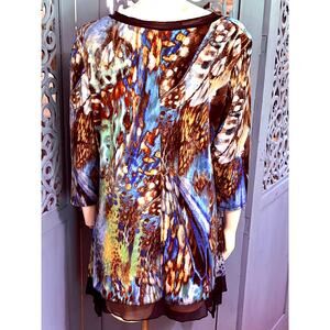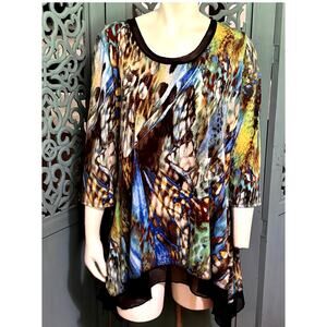 Gorgeous bright butterfly wing pattern flowy knit top. Has sheer black around round neck and handkerchief hem (comes to a point on each side but is straight across front and back). Measures 22" from pit to pit when lying flat, 30" in front and back from shoulder, and 35" on each side. Excellent condition.