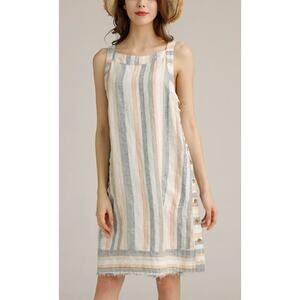 Peck & Peck Knee Length Shift Dress Women Large Multicolor LINEN Striped Sleeveless Bateau Neck Yarn Dyed Fabric Straight Beach Coastal Nautical Classic Comfort Pockets Side Buttons