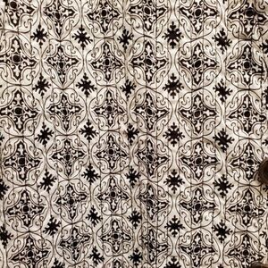 The color scheme is black and white. Paisley on one side and an equally busy reverse side.....;) Lightly quilted.