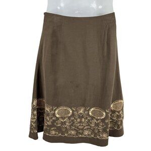 silk linen skirt embroidered skirt A-line skirt Peck and Peck skirt brown skirt size 8 skirt floral hem skirt vintage style skirt side zip skirt mid-length skirt womens skirt casual elegant skirt brown gold embroidery