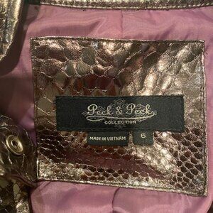 Bronze colored, soft shiny material, zippers with cinched waist and 3/4 sleeves. Adorable with jeans to dress up a casual look.