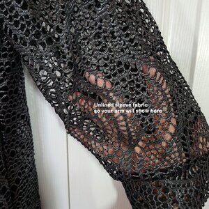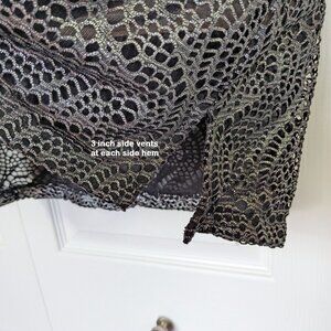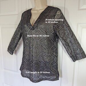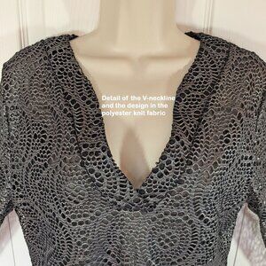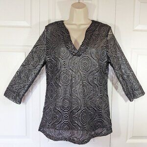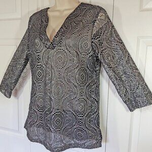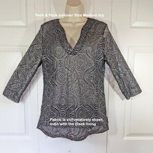 From Peck & Peck, this pullover V-neckline top is a black scroll design knit polyester fabric with a silver metallic overall shine. The body of the blouse is lined in solid sheer black polyester, however the 3/4 length sleeves remain sheer. As you can tell from the photos, the lining is sheer.