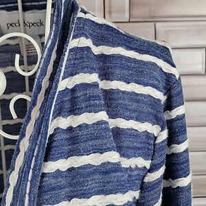 Cotton polyester blend lightweight cardigan by Peck & Peck great for a summer cover-up with a scarf front and decorative white striped stitching. Great pre-owned condition.
