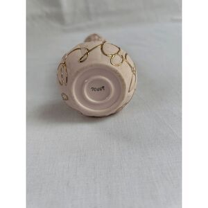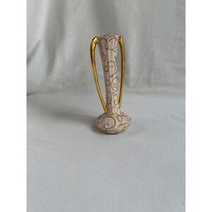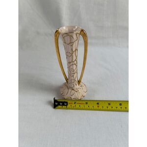 This is a small decorative vase that is very pretty. It is small, measurements are in the pictures. It is a very light pink with gold swirls on it and gold handles. This inside in a little dusty and dirty, but nothing that can't be cleaned. I have no idea the brand or anything about it.
