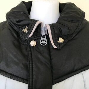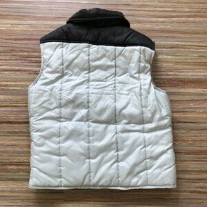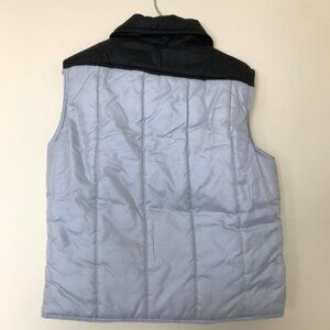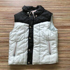 Vintage puffer vest was made in Canada by brand Pedigree (Chadon Mfg). Black/silver colorblock design with full zip front closure and pockets at each hip with zipper closures. Fits chest size 40 , see below for garment measurements. Pre-owned vintage vest has a few small scuffs/marks to nylon fabric. Collar is pinned in place with western-themed pins (cowboy hat/saddle), pins can be removed but have left marks to the fabric.