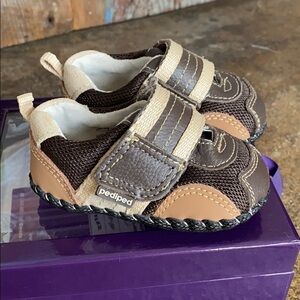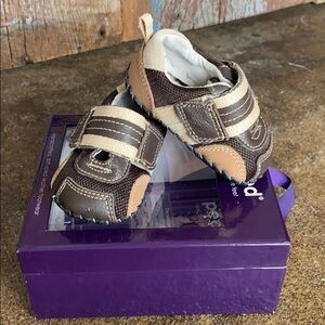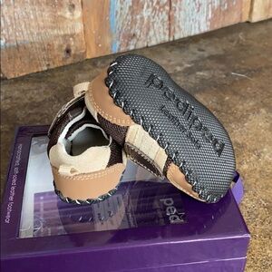 Here is a fun pair of Pediped Brown & Tan 0-6 Months Leather Shoes. These have soft and flexible soles that are recommended by pedestrians because they allow children to closely mimic barefoot walking. Box may have dents from storage.