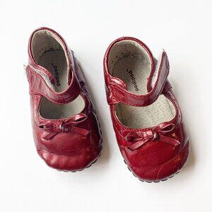 These shoes are so cute, and perfect for the holidays! Burgundy with a patent leather look. Soft soles with a Velcro strap. Listed as GUC for some wear/nicks on the bow & straps, please see photos for color wear. Still have lots of life left and inside has minimal wear. Size 12/18 mo.