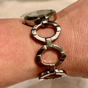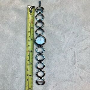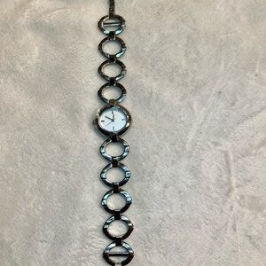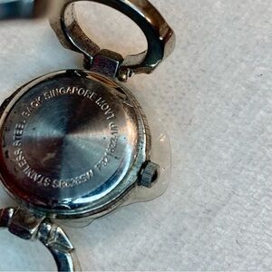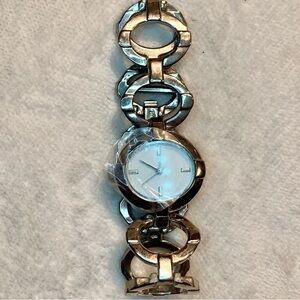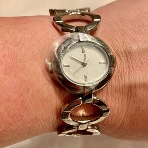 Silver-Toned Link Design with a round face and stainless steel back. Never been worn, has original plastic cover on the face. Will need a new battery due to age of original.