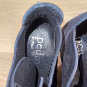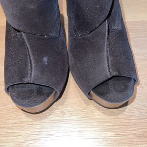 Excellent condition Worn 2 times (see photos) Cork Platform Black suede Pedro Garcia Chenoa peep-toe ankle boots with covered heels and strap accents at ankles with wrap velcro closures. 4.5" heel 1" Platform feels like a 3.5" heel