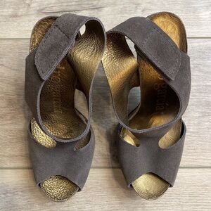 Chic and minimalist taupe suede and gold leather sandal heels by Pedro Garcia made in Spain. Large cut outs on the sides give a sleek soft t strap look with a wide ankle strap and easy wear Velcro closure. Heel approximately 4.5" tall with a 1" platform at the toe. Excellent condition, Like New with no flaws. Size 36.5 Comparable to a US Size 6