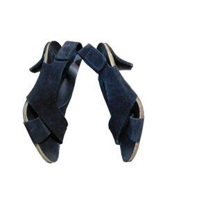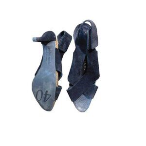 suede leather uppers and hook loop fastener wider back slingback strap, open toes, criss cross strappy uppers and approx 3" heels