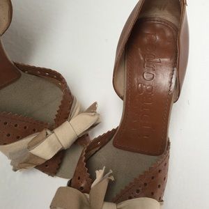 Tan leather with beige ribbon/bow. These are a half size too small for me so they are in excellent used condition. Made in Spain