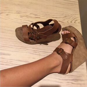 Pedro Garcia wedges with leather straps and suede heel with two buckles on each strap.