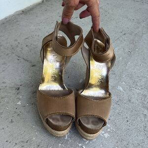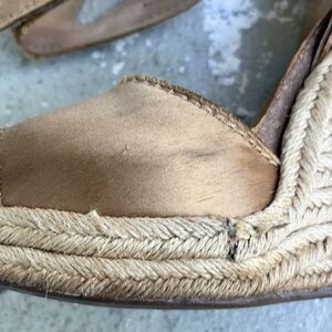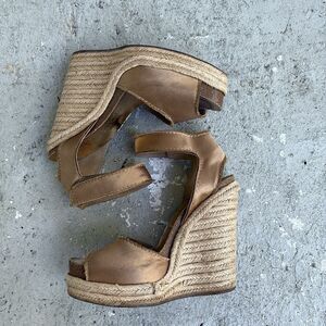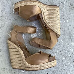 They have a brawn satin finish to them with a Velcro closure. Please look at the pictures. They are in good condition but not perfect. Platform height is 2 inches heel height is 5 inches.