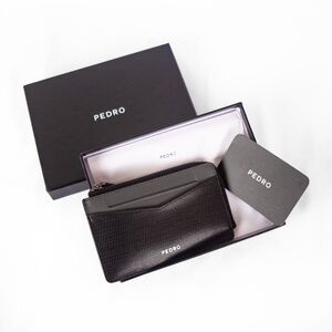Keep your cards and bills organized in style with this sleek black embossed leather card holder from Pedro Singapore. Created with six card slots encased within, it still remains slim and flat making bulky wallets a thing of the past. This sophisticated card holder combines functionality with premium craftsmanship, featuring Pedro's signature clean lines and modern aesthetic. Perfect for the style-conscious professional who values both form and function.