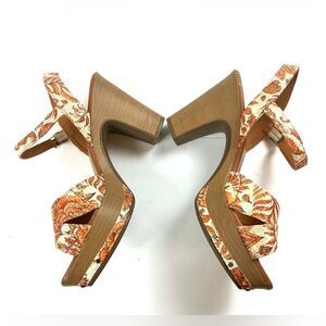 Step out in style with 's Women's Floral Platform Sandals by Pedro Miralles. Featuring a chic brown and cream and orange floral design, these sandals offer both comfort and elegance for any occasion. Slingback sandals with metal stud accents. Gently worn. Made in Spain