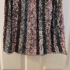 Peek Girls Sequin Skirt Striped Multicolor Gray Pink Rainbow Size Large 10 years. Such a beautiful skirt. Has been worn and I am sure that it is missing a sequin somewhere, but no major issues that I can find. So pretty. Good Used Condition.