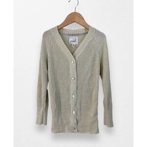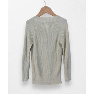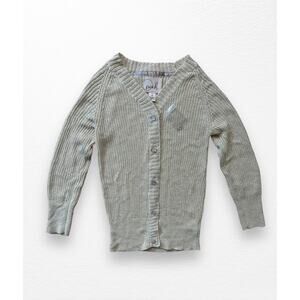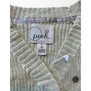New without tags lightweight ribbed cardigan from Peek in size 8. Cream/sparkly metallic gold. Extra button attached.