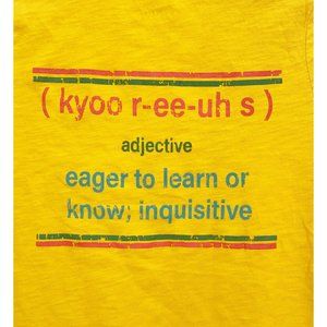 Boys short sleeve, crew neckline cotton tee with 'Curious' text on the front and 'eager to learn or know, inquisitive' text on the back of the tee.