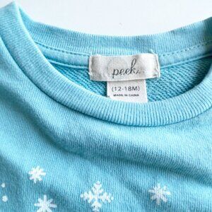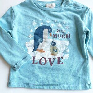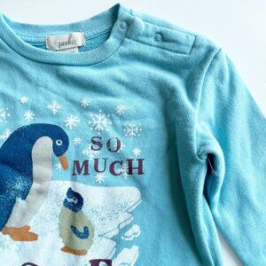 Peek penguin love winter sweater. Adorable solid top with a round neckline, long sleeves, penguin family graphic on front, heart graphic on back, and pullover construction. This was sold in a set with pants but this listing is for the sweater only. New without tags. Size 12-18 months.