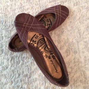 Peep toe flats in like new condition. Worn twice and a pretty purple denim. Great for transitioning into fall