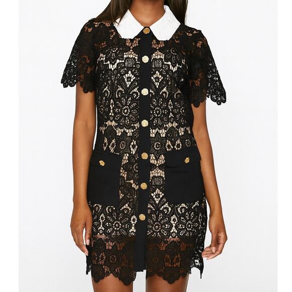 Peekskill Black Lace Collared Mini Dress Women's S Sheer Lined Button Front