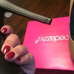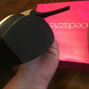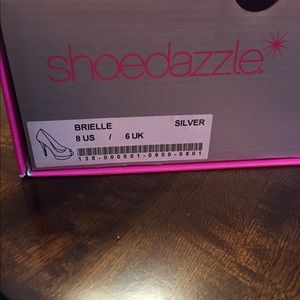 Shoedazzle brand. NEVER worn. Size 8. Box says they are silver but I think they look more like a muted gold color. Stiletto heel, 4+ inches high.