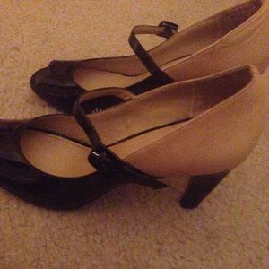 Franco Sarto Black and Tan leather peep toe pumps worn a couple times