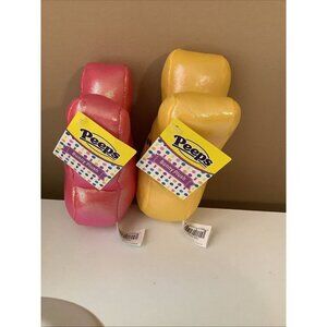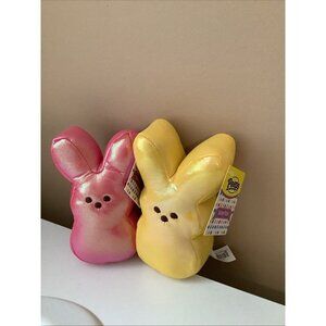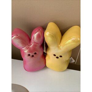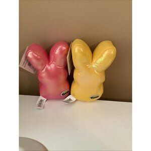 The product is a set of 2 shimmery metallic plush bunnies from the brand Peeps. Each bunny measures 6 inches in size, making them small stuffed animals perfect for play or collecting. These adorable bunnies come brand new with tags attached, making them a great addition to any collection of stuffed animals. Pink and yellow plush bunny