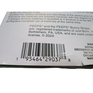 Peeps Bunny LED String Light perfect for Easter. Features pink, blue, yellow, and green classic peep bunnies. Batteries not included, uses 2AA batteries. Ideal for Easter tree, tablescape, baskets, or bonnets. 10 Lights per string. Lights measure 2.25" by 1". Box measures 8.5" by 6.75" by .75".