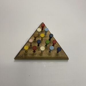 This vintage peg game is a wooden triangle mental block puzzle that challenges players to strategically remove pegs from a triangular board. The goal of the game is to eliminate all but one peg by jumping over them with adjacent pegs, testing players' problem-solving skills and patience. The retro design and nostalgic appeal make it a charming addition to any vintage toy collection or a fun way to enjoy a classic game from the past.
