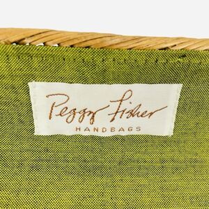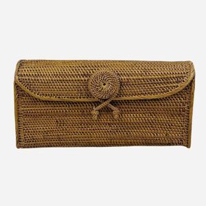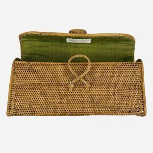 Peggy Fisher Woven Clutch Purse Natural Bali Hancock Baskets Handmade Boho Cute Handbag Collectible Gift Rattan Wicker Ate Vine Eco Friendly Handwoven Indonesia Bali Unique Rectangle Button Clasp Pockets Designer Quality MCM Mid Century Artistic