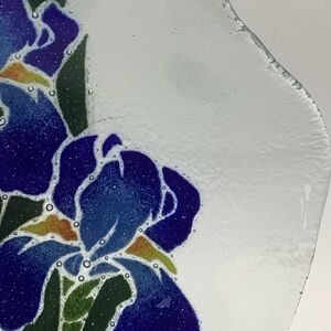 Beautiful Peggy Karr art glass bowl featuring blue iris flowers and scalloped edges. Hand fused glass. Pre-owned but the tag is still attached to bowl and booklet is included.