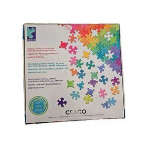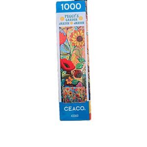 The product is a pre-owned 1000 piece jigsaw puzzle titled "- Peggy's Garden - Joy in The Morning." It is manufactured by Ceaco and measures 26.6 x 19 inches when completed. The puzzle comes in a package with dimensions of 8.07 x 7.91 x 2.32 inches and weighs 1.12 pounds.
