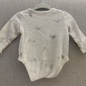 Adorable baby one piece in a soothing cream color with a charming bird print. Perfect for keeping your little one cozy and stylish.