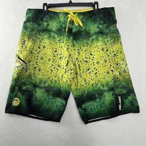 Pelagic Shark Skin Board Shorts Mens Waist 39 Green Yellow Surf **FLAWS READ