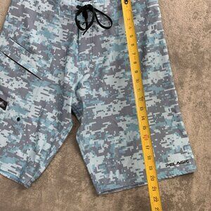 The Pelagic Shorts for men in size 32x12" are designed for fishing enthusiasts with a blue camo pattern, perfect for outdoor activities. Made from a blend of polyester and spandex, these lightweight and stretchy boardshorts offer quick-drying capability and comfort.