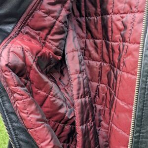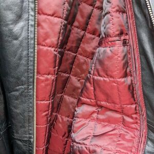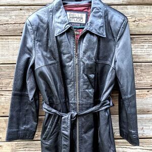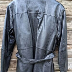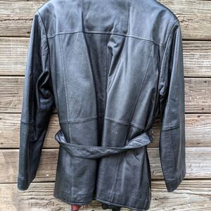 black leather women's jacket in excellent condition mid length w/sench belt. size XL measurements are pit to pit 22,,,,,waist 21,,,,,, length 31