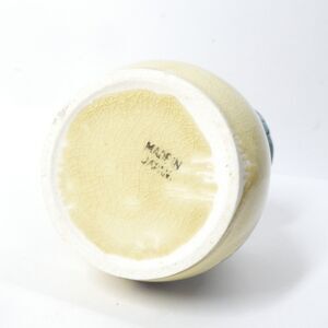 Vintage ceramic creamer made in Japan. The side features a painted design of a pelican bird eating a fish, with flowers in the background. The handle is shaped like a cat. This cream pitcher measures 3.5 inches tall. It shows overall crazing in the glaze, but no chips or cracks.