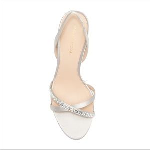 A satiny, ballroom-inspired sandal blends graceful lines and curvy straps adorned with crystal embellishments at the toe