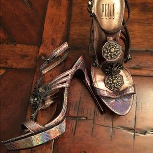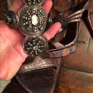 Never worn. Gorgeous holographic snakeskin platform stilettos with crystal accents. Ankle strap.
