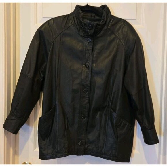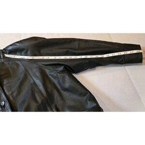 The Pelle New York Milano Leather Jacket in size medium for men is a vintage piece with a classic black color and mid-length design. Made with high-quality leather and featuring a button-up closure, this overcoat-style jacket includes stylish details like a collared neckline, shoulder pads, and pockets. The jacket is designed for regular fit and is recommended to be dry leather cleaned only. Please see photos for details and measurements. Fast shipping and smoke free home.