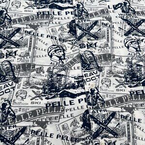 All over print with mountaineering themed items. SKi boots, Montana the dog, parka, 1978.